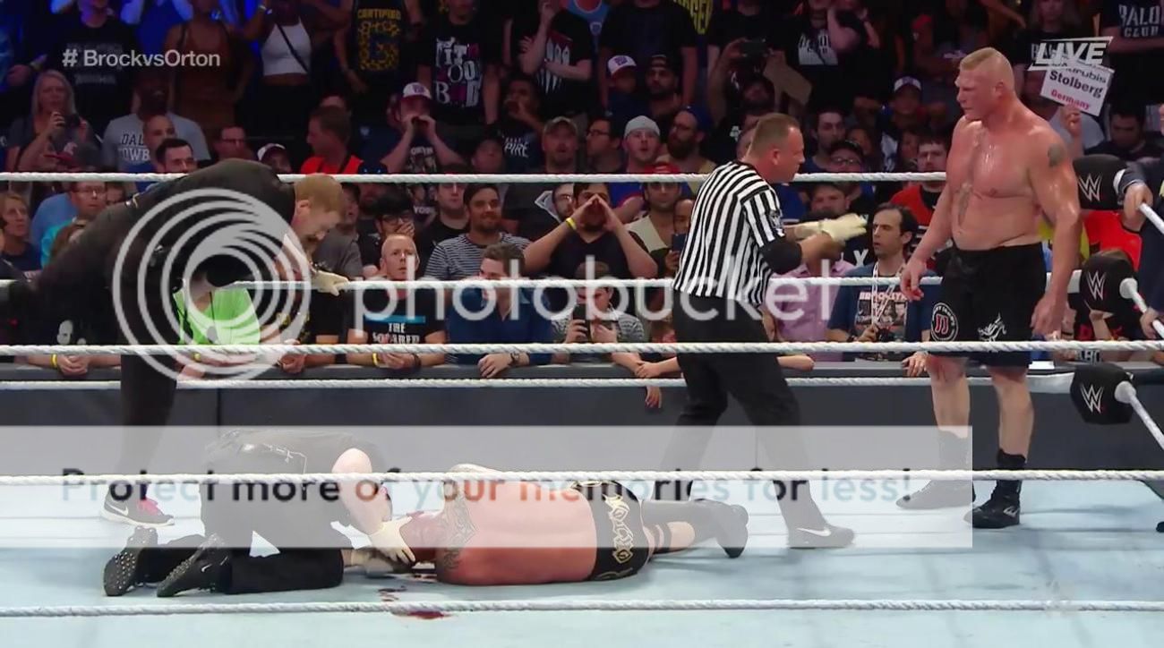 Soon after Lesnar hits Orton a F5 and tries to cover him and this time Orton kicks out. Out of frustration Lesnar removes his combat gloves, mounted on Orton and starts to show off his MMA ground and pound skills. During this blows to Orton, Lesnar hit Orton's head with his elbow and it seemed like Randy went unconscious for a while and when he woke up his head was in a pool of blood. His head was busted open and this time it did not seem like a blade or a razor was responsible for the wounds. Blood was pouring out of Orton's head and Lesnar wins the match with a Technical Knock Out (TKO). Finally just before Summerslam went off the air Shane McMahon comes to the ring to check on Orton and he gets a F-5 as well from Lesnar.